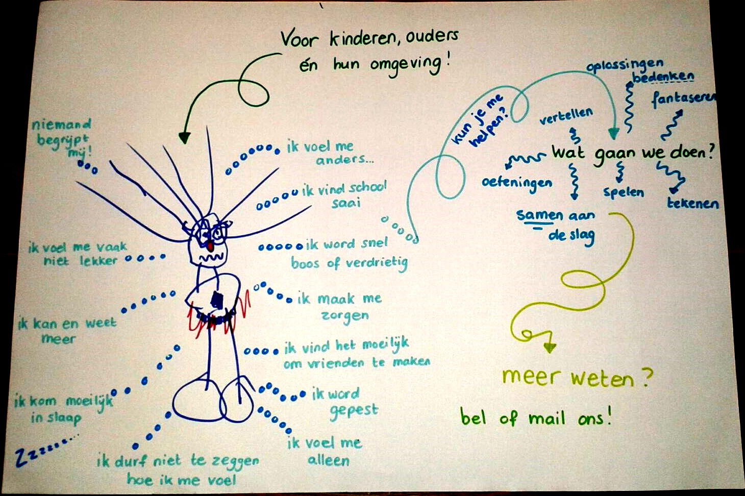 Wij helpen vanuit Senzai sinds 2009 ouders en kinderen met verschillende ‘problemen’. Op de mind-map die we hebben gemaakt kun je zien waarmee we jou en je ouder(s) kunnen helpen. Nu kun je misschien denken dat je geen hulp nodig hebt…. maar iedereen heeft wel eens een steuntje in de rug nodig. Dat wil helemaal niet zeggen dat je het zelf niet kunt! Het gaat soms alleen wat makkelijker als iemand even met je meekijkt. De meeste kinderen doen bij ons mee aan een groep. In die groep kunnen we jou tips geven en kun je dingen samen met anderen oefenen waardoor het soms net wat makkelijker kan gaan. Ook geven we tips aan je ouder(s) en school en doen veel ouders bij ons ook mee aan een groep. Op deze manier kan iedereen je misschien wat beter begrijpen en ook beter helpen. Of je komt met je hele gezin samen voor gesprekken. Allemaal spannend maar vaak ook leuk en hopelijk ook helpend.